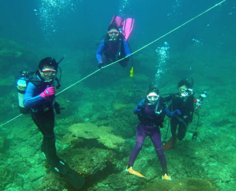 体験ダイビング三人に二人のインストラクターがつくファンダイビングと4名のグループに分かれ、大島南岸のポインへ