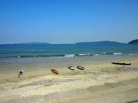 玄海島まで片道約12q、大型船の航路が近い事、玄海島周辺に三角波が立ってる事や長距離との理由で初心者は止めた方が良いとショップからアドバイス。急遽、二手に分かれる。ヤマ○さんとフジ○クン、アンド○クンは能古島一周。僕とチューさん、飛び入りのカツ○さん達タンディム艇と一路玄海島へ。昼食は大原のレストラン「プカプカ」で皆と待ち合わせ