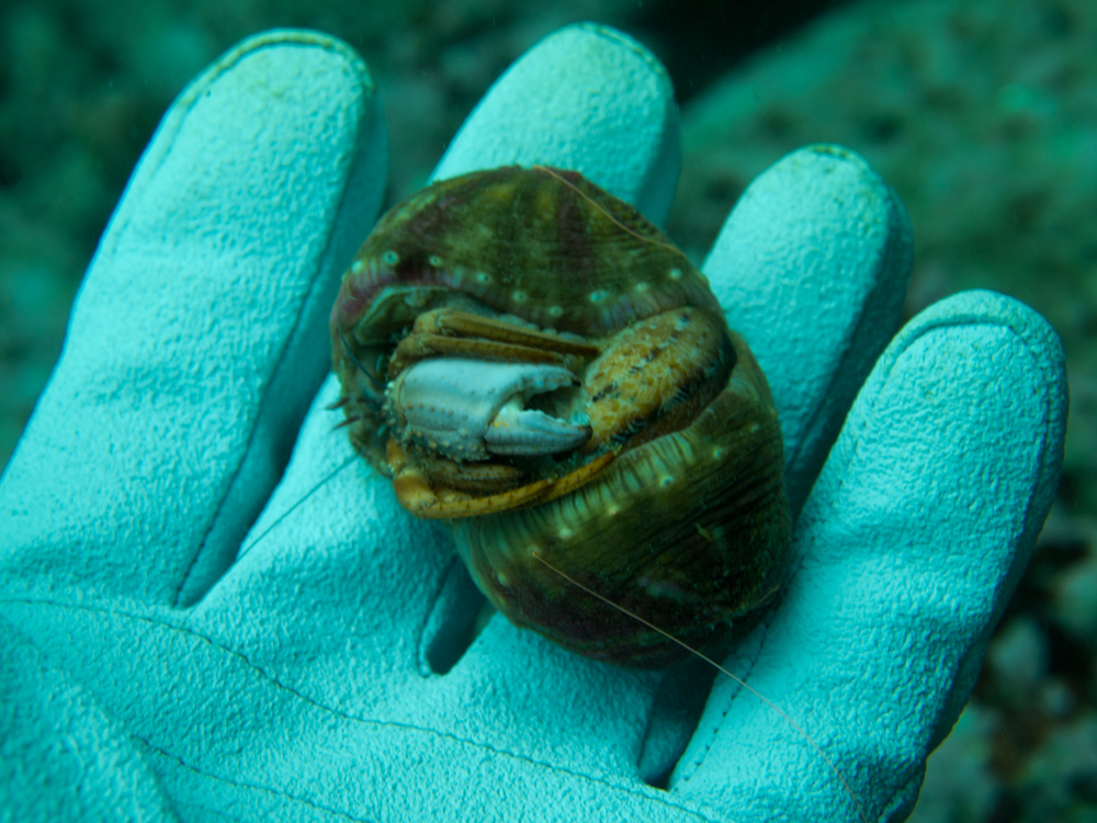 潜ったら目前に、ダブルでイソギンチャクを付けたデカいヤドカニ