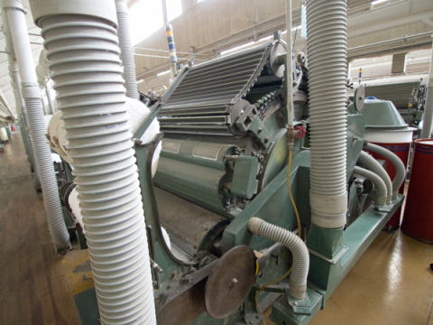 洗った原糸を沢山の針が着いた機械に入れ繊維をばらしていく。すごく古い建物なのに天井のノコギリの刃のような明り取りで明るく省エネ!