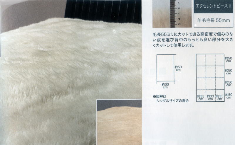 | ●生後8ヶ月から1年以内の子羊の毛皮を厳選し、シングルで約6頭分を使う |